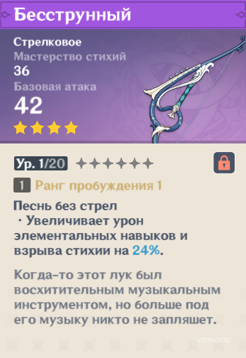 Бесструнный в Genshin Impact – четырехзвездочный лук, который можно получить в процессе игры. Относится к серии Бродячий ансамбль. Гайд расскажет о характеристиках, на кого одеть и как эффективно использовать.