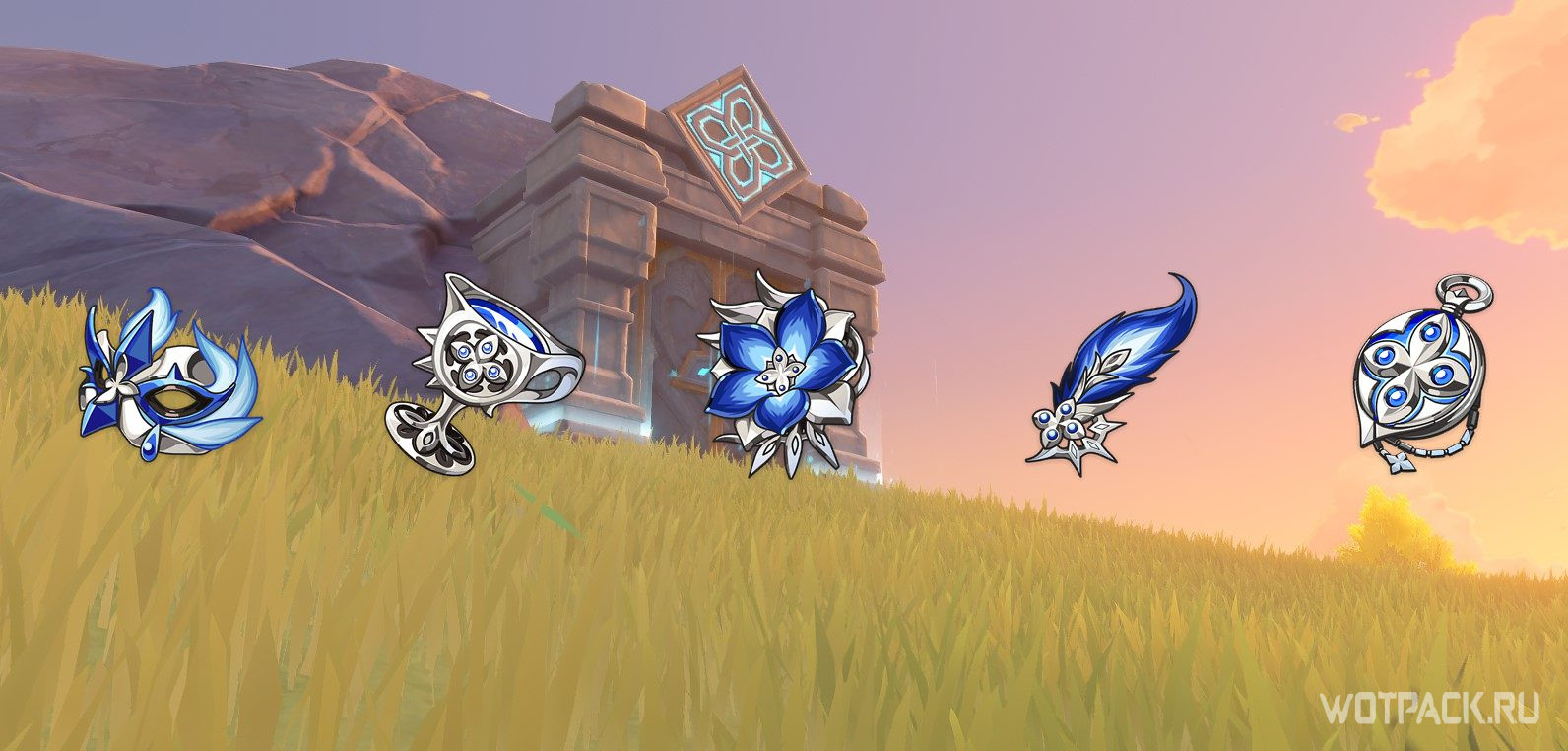 Основные характеристики артефактов выпадают рандомно. Единственные исключения – Цветок и Перо, которые всегда дают здоровье и силу атаки соответственно. Ниже представлена таблица с возможными сочетаниями характеристик для каждой части комплекта Бледный Огонь.