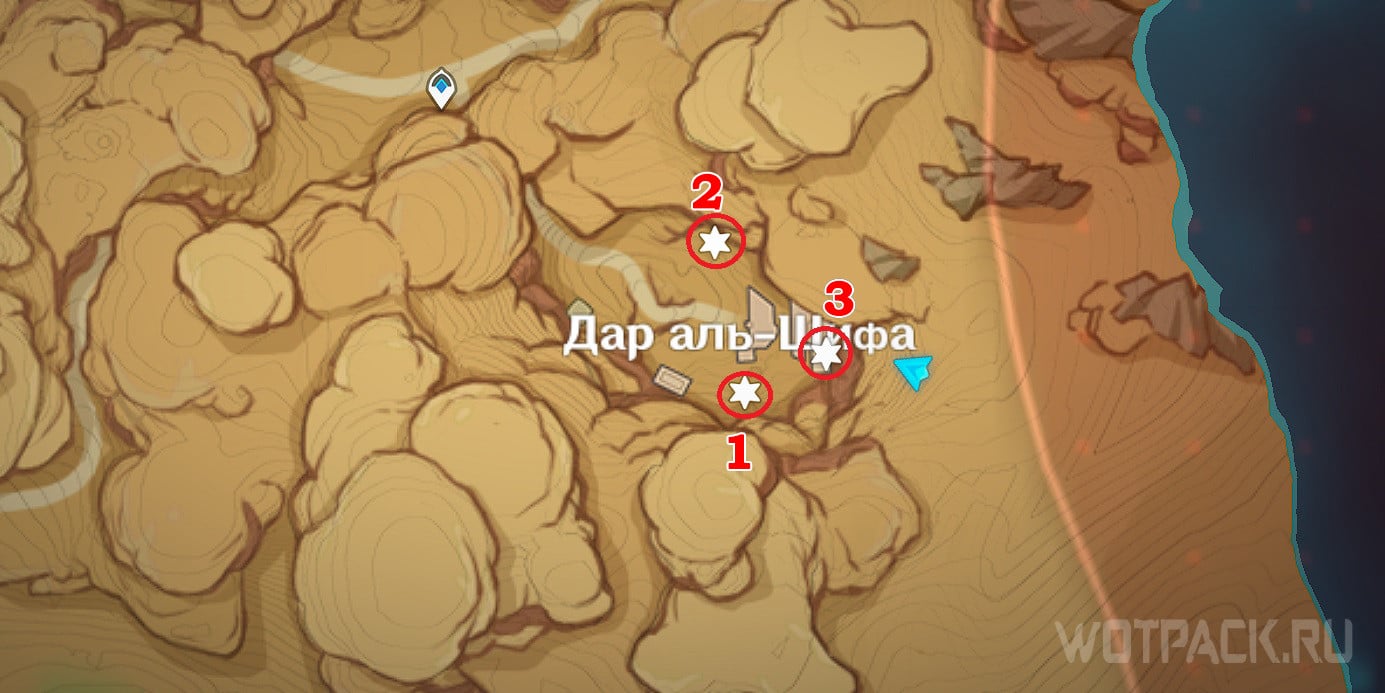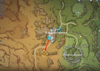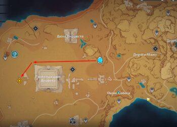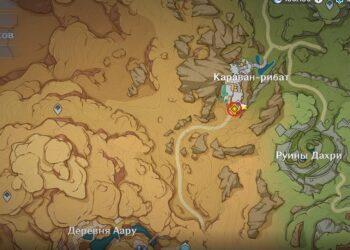 Больница лечения элеазера находится на юго-восточной стороне пустыни в области Дар аль-Шифа. Парите вперед к воздушному потоку и перелетите через обрыв с помощью четырехлистного символа и направляйтесь прямо от телепорта. Впереди можно заметить двух хиличурлов-стрелков. Их необходимо одолеть, но они сразу призовут союзников.