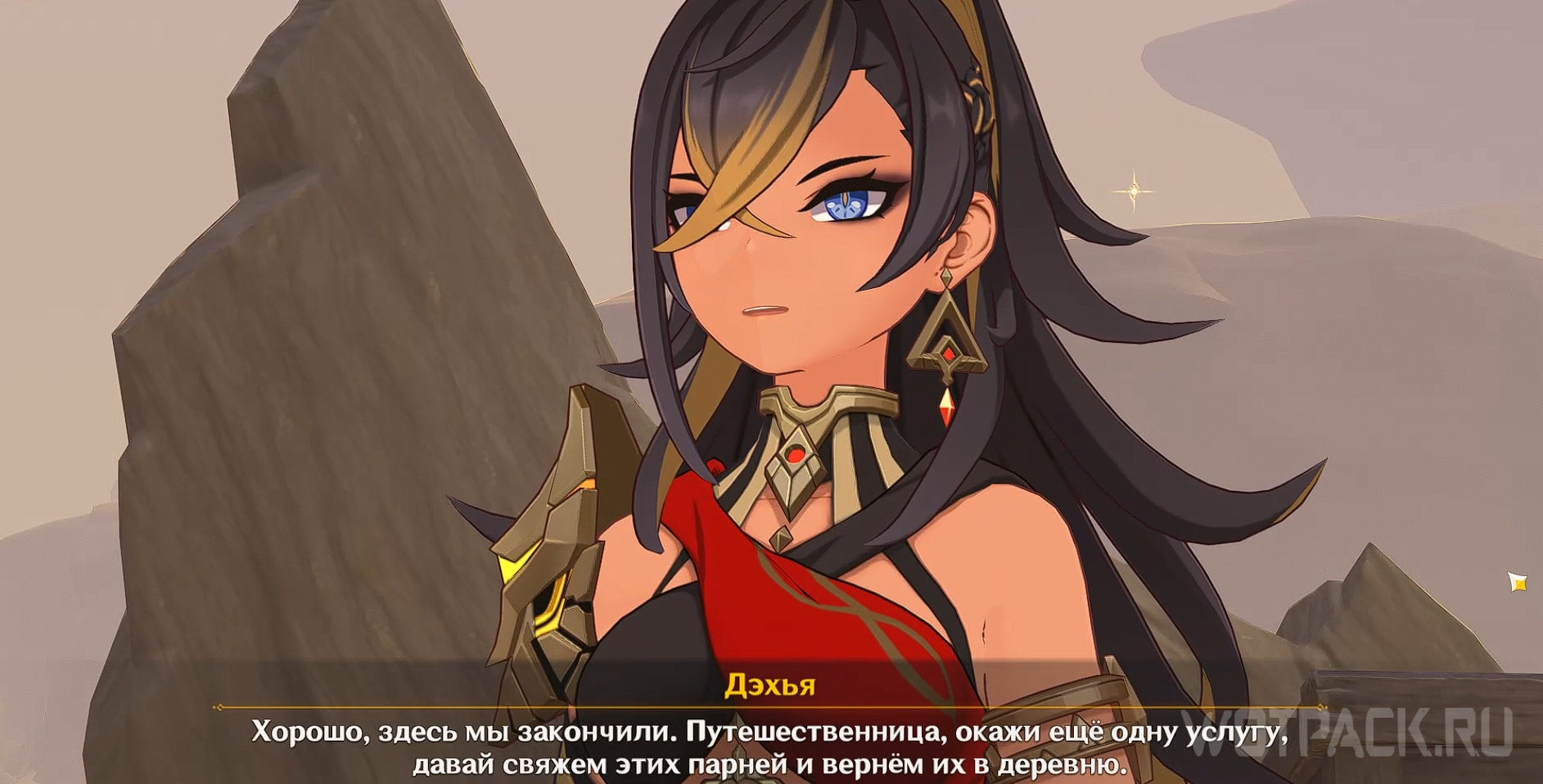 Отправляйтесь обратно в Аару и расскажите остальным, что удалось выяснить. Заметив слежку, Дэхья предложит отправиться к Караван-рибату. В местной таверне она периодически сталкивалась с тем, как ее товарищи обсуждали царя Дешрета и идеи о перевороте в Сумеру, что может стать ценным источником информации.