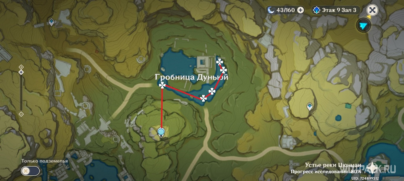8 растений можно зафармить в окрестностях гробницы Дуньюй. Телепортируйтесь к Статуе семи Архонтов и, дойдя до водоема, двигайтесь сначала на восток, а потом на север.