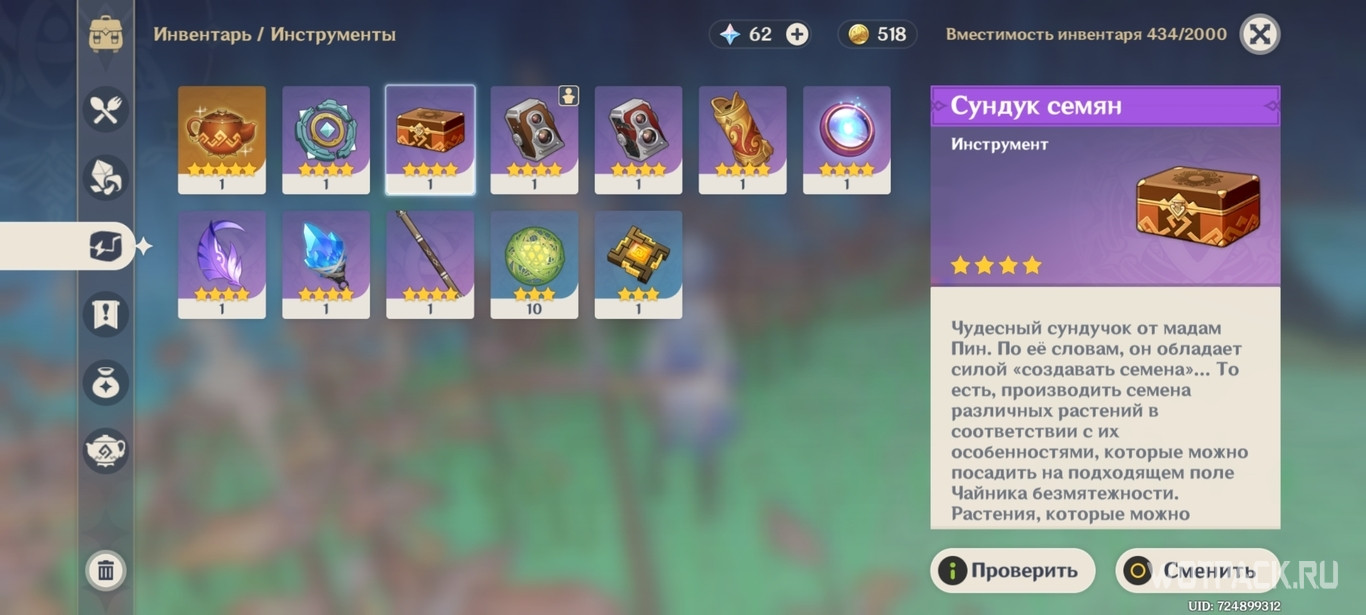 - Использовать Сундук семян. После достижения 3 уровня репутации в Инадзуме мадам Пин даст его путешественнику за выполнение квеста «Искусство садоводства». Чтобы получить семена, нужно экипировать Сундук и собрать нужные растения.