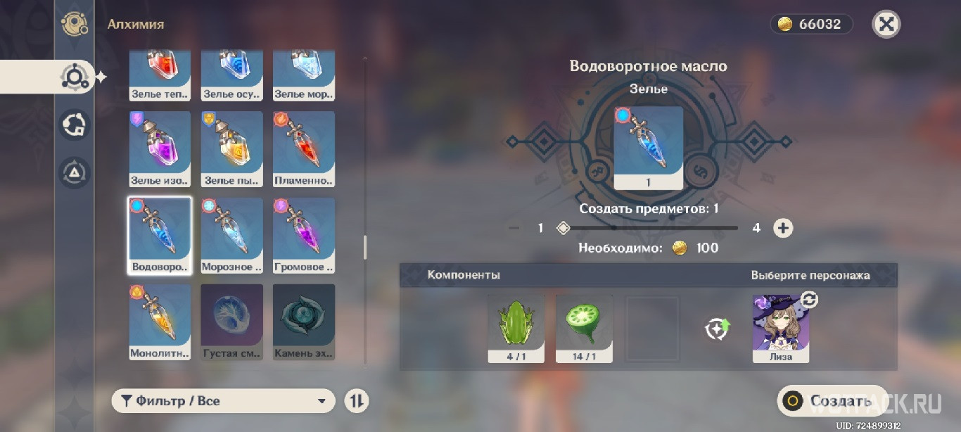 - Водоворотное масло увеличивает Гидро урон всех членов отряда. Для создания понадобятся 1 чашечка лотоса и 1 лягушка.