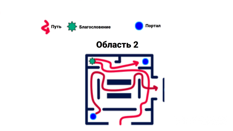 Во второй комнате впервые появятся порталы. В этой области всего одно благословение. Сначала по правой стороне добегите до него, а от баффа к телепорту, расположенному напротив. Окажетесь в левом нижнем углу, а оттуда двигайтесь наверх и, проходя через центр, направляйтесь к выходу.