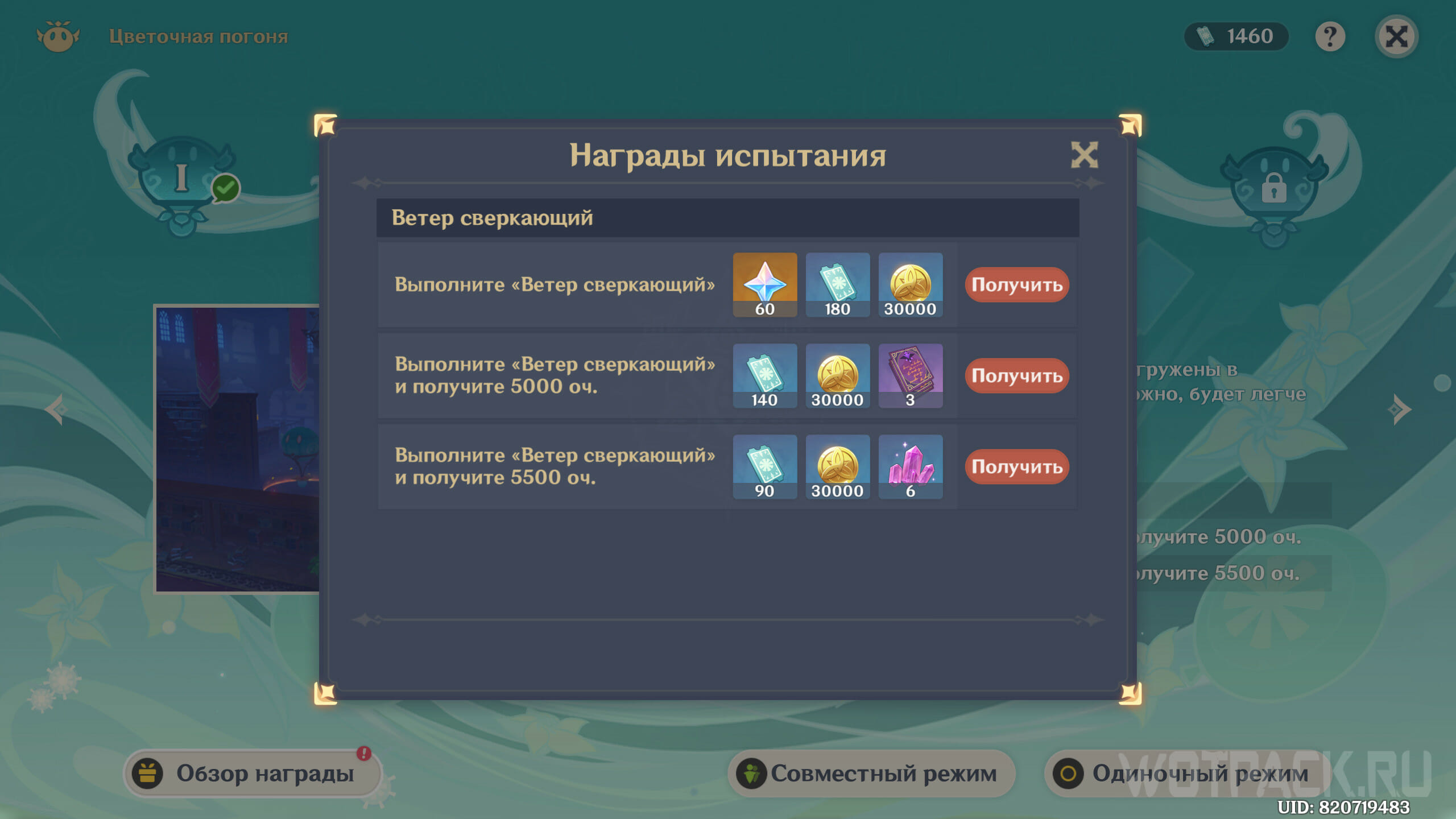 - Камень Истока x60, Цветочные купоны x180, Мора x30000 за прохождение этапа «Ветер разделяющий».