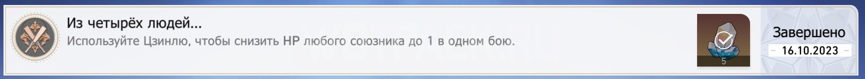 - Из четырёх людей… — Используйте Цзинлю, чтобы снизить HP любого союзника до 1 в одном бою. Награда: звездный нефрит ×5.