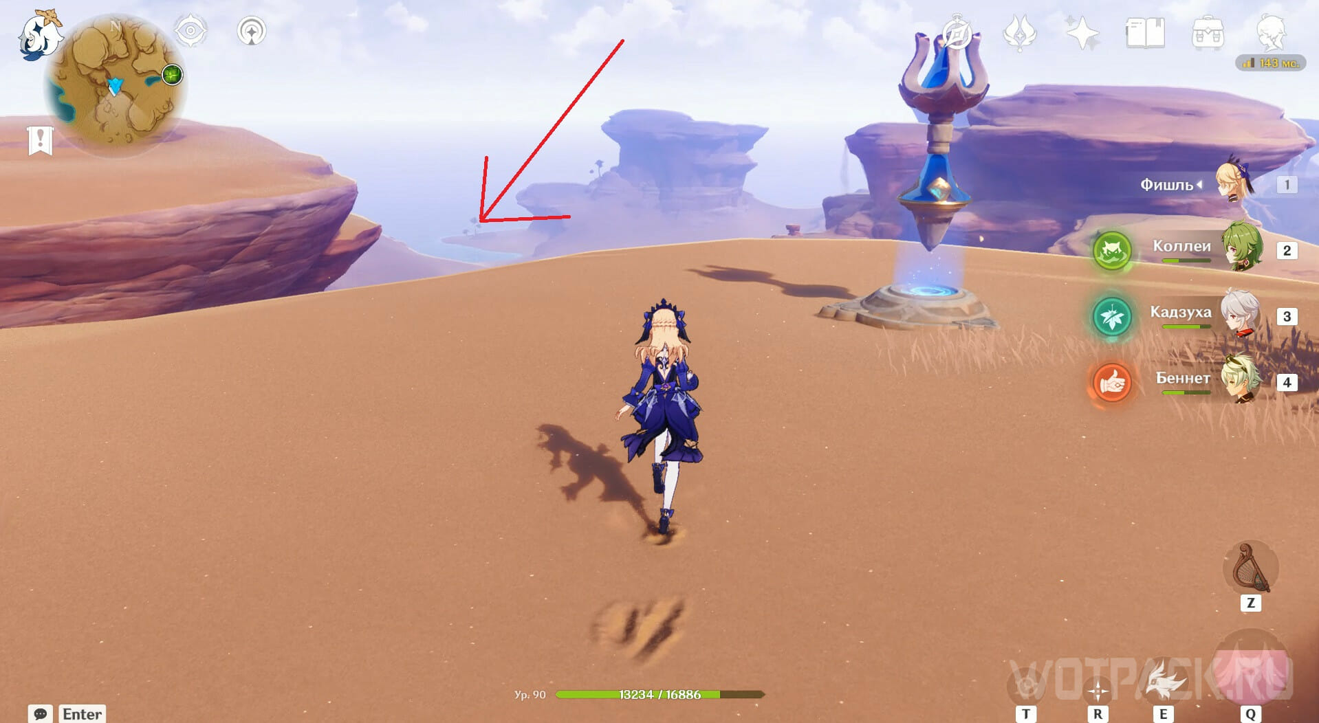 Арена с Дендро кубом находится в пустынной части Сумеру, в пещере на юге от Дар аль-Шифа. Чтобы быстрее добраться до него, используйте телепорт слева, но не бегите сразу по направлению к боссу: он находится под землей. Спуститесь вниз и летите слева, там увидите пещеру.