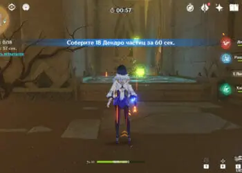 Для завершения испытания нужно собрать 18 Дендро частиц за 60 секунд. Необходимо сделать круг: пройти по лестнице наверх, пробежаться по первому этажу, после чего зайти на верхний этаж и спрыгнуть в шахту с лопастями. За выполнение получите обычный сундук.