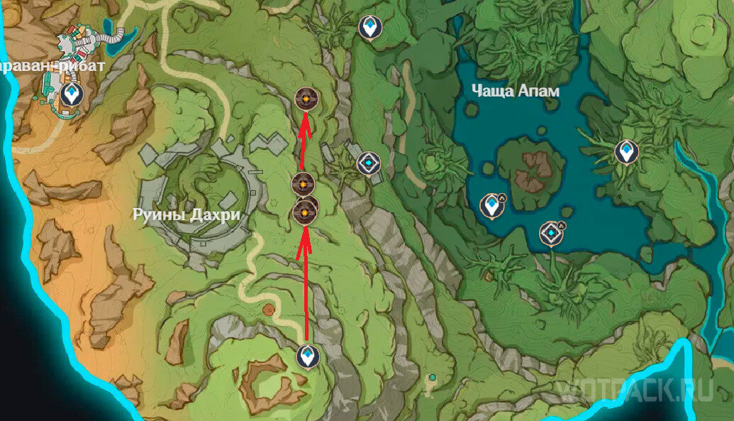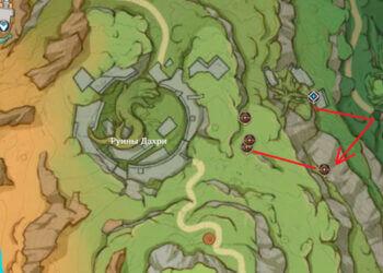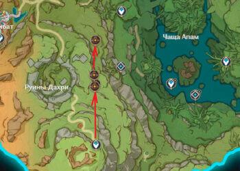Всего в Сумеру и пустыне можно найти больше 30 драконов руин. На карте отмечены оба вида этих противников. Пять из них запечатаны в каменных колоннах и являются одноразовыми. В дальнейших пунктах рассмотрим только тех, что можно фармить на постоянной основе.