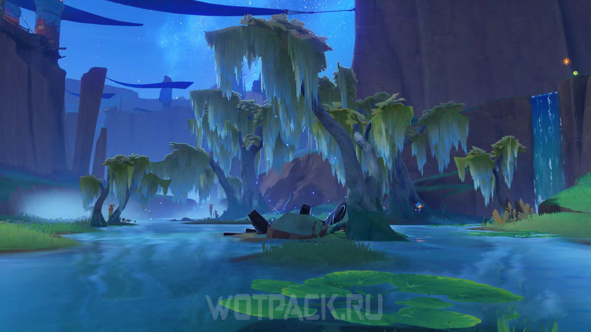 Переместитесь к любому удобному телепорту на Стадионе Священного пламени и спуститесь к реке, чтобы собрать древесину пепельного аратику в Натлане. Рядом с водой растут деревья, с которых можно получить необходимый ресурс, а у их корней встретите сверкающие хризантемы. Локация не отличается удобством для бесконечного фарма из-за наличия возвышенностей и большого расстояния между деревьями, однако все еще можно выделить приемлемую зону сбора.