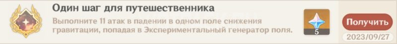 Perform 11 fall attacks in one Gravity Reduction Field while hitting the Experimental Field Generator. Reward: primogems ×5.