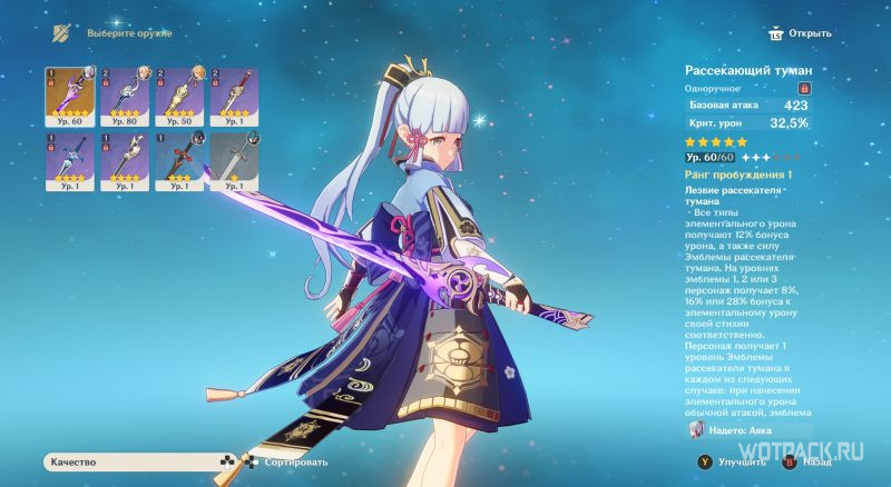- Ayaka - a signature weapon for her. The girl is able to easily activate all 3 emblems and deal constant high Cryo damage due to the synergy of her skills and Fog Slicing.