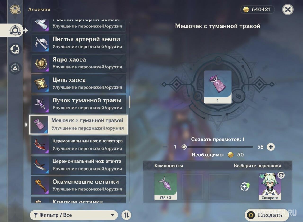 Основной дроп с противника – пыльца туманной травы, мешочек с туманной травой, пучок туманной травы. Дополнительно могут выпасть шевроны Фатуи.