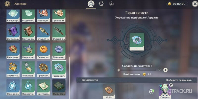 Воспользуйтесь Алхимическим столом для создания материала и в открывшемся меню выберите фильтр – Улучшение персонажей/оружия. После этого пролистайте почти в самый конец и найдете две разновидности гард: Кагэути и Прославленные.