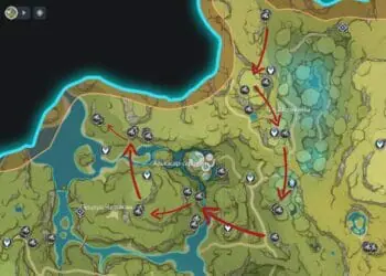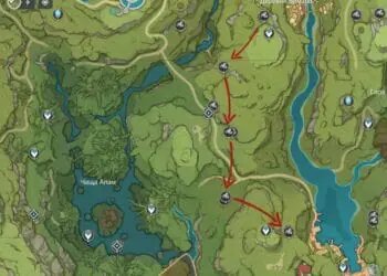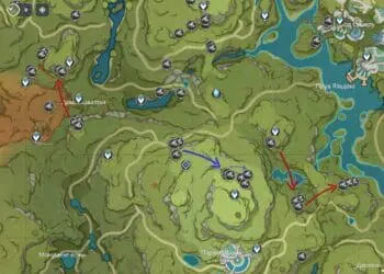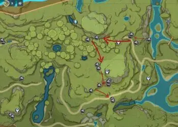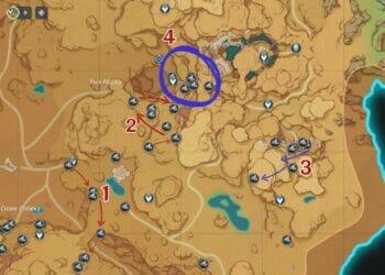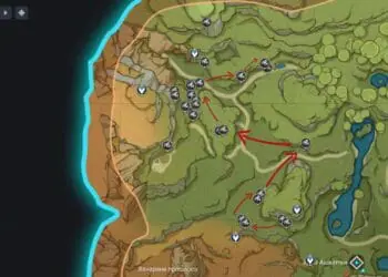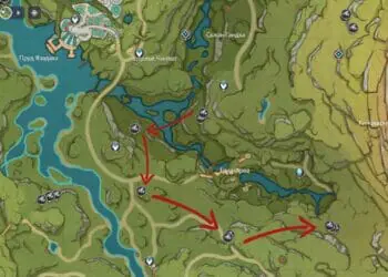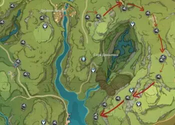 Начинайте майнить железо в районе 3-х путевых точек, указанных на карте. Это снизит время на передвижение до месторождений. Рядом с ними всегда охрана в виде хиличурлов или охотников за сокровищами. За 15 минут легко заработать 35-40 кусков необходимого ресурса.
