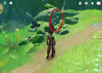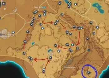- От той же Статуи планируйте на юг к залежам на берегу. Рядом лагерь хиличурлов, но в конфронтацию вступать необязательно.
