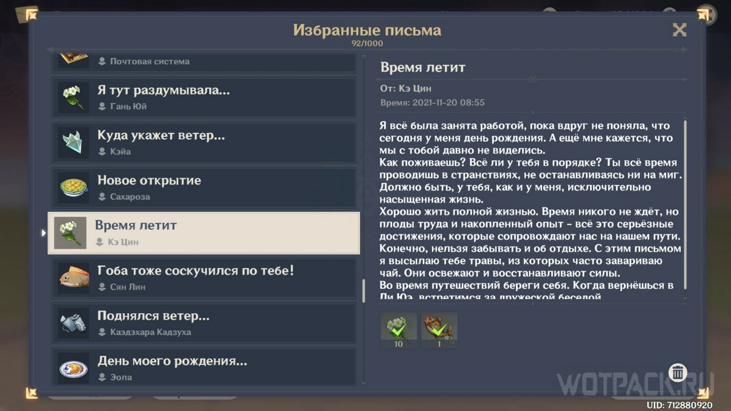 В дни рождения Кэ Цин (20.11.21) и Гань Юй (02.12.2021) с письмами пришло 10 и 5 цветков цинсинь. Читайте про все подарки на дни рождения персонажей, чтобы получать ресурсы.
