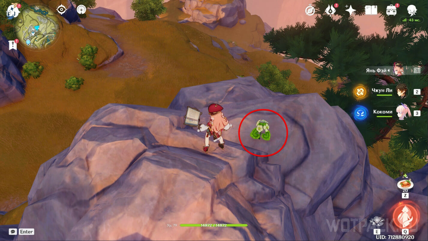 Начинайте фарм у точки телепортации на юге от Долины Яоде в Южных холмах Чэньюй. Заберитесь на скалу с юго-восточной стороны и соберите на ее вершине одно нужное растение.