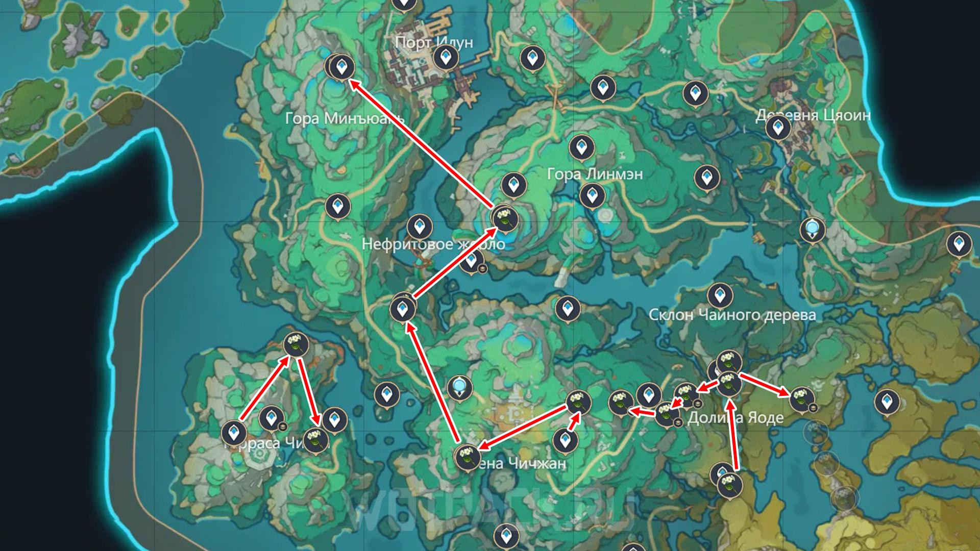 - Далее летите в сторону начального телепорта данного маршрута. Западнее него 1 цинсинь, неподалеку севернее 3.