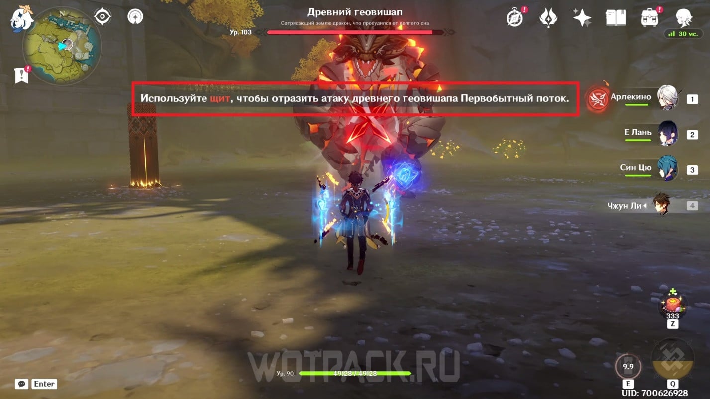 Используйте щит, чтобы отразить атаку древнего геовишапа Первобытный поток. Награда: камни истока ×5.