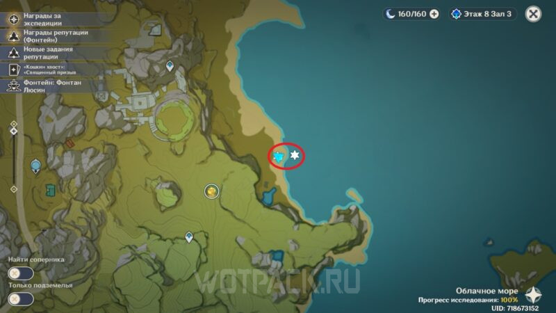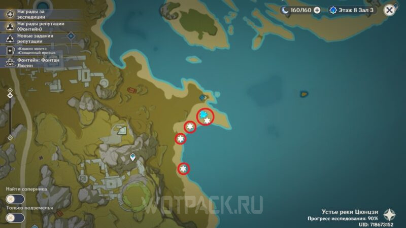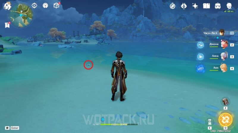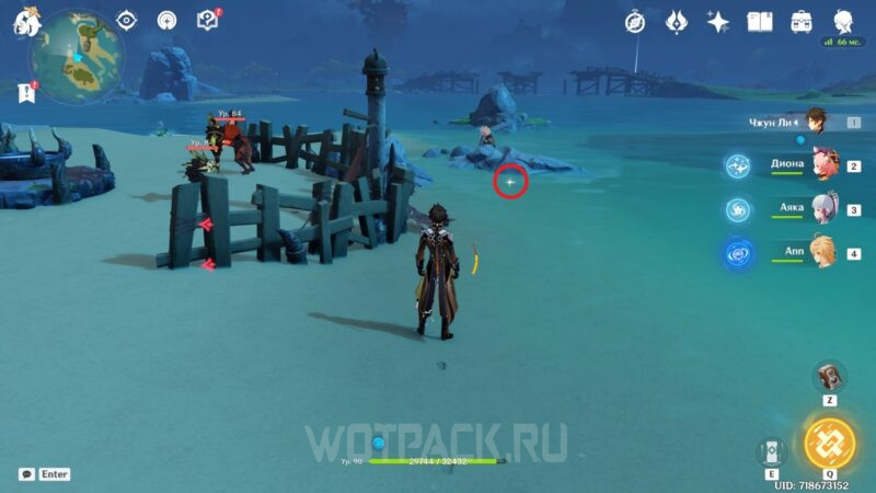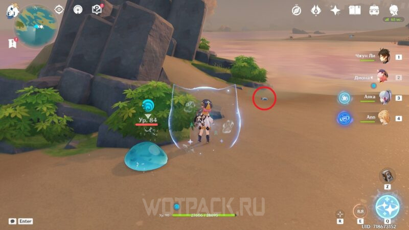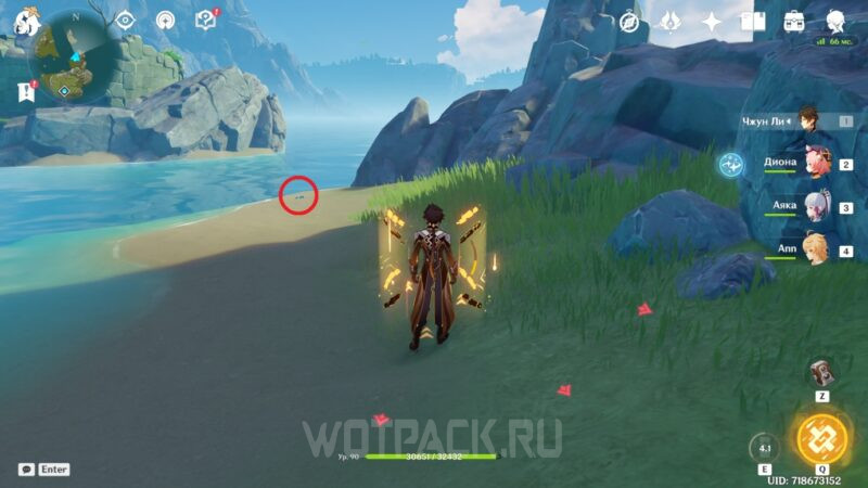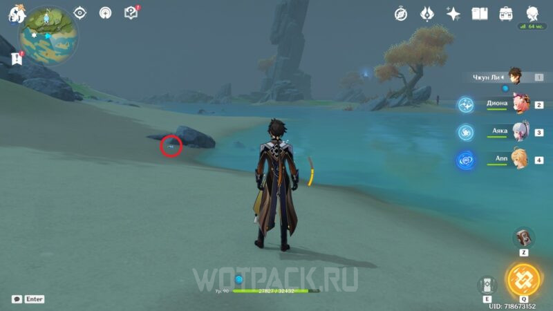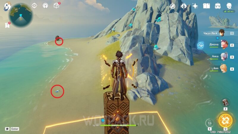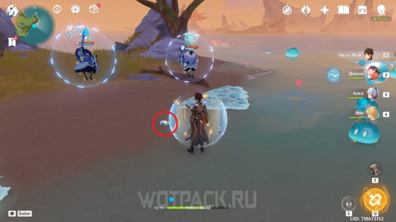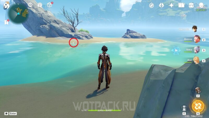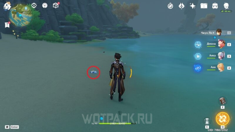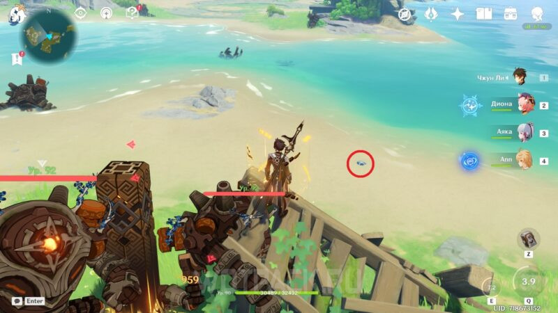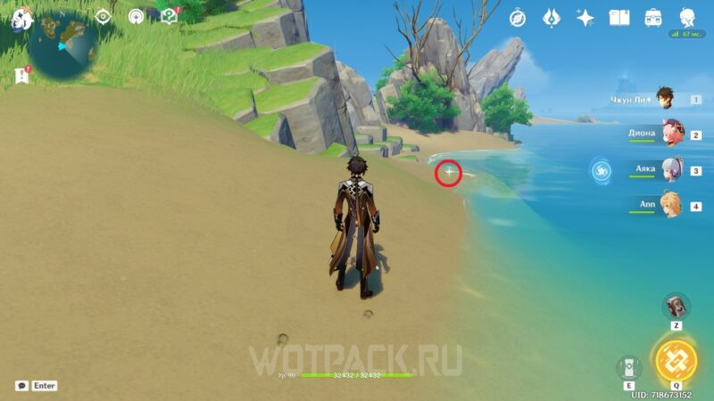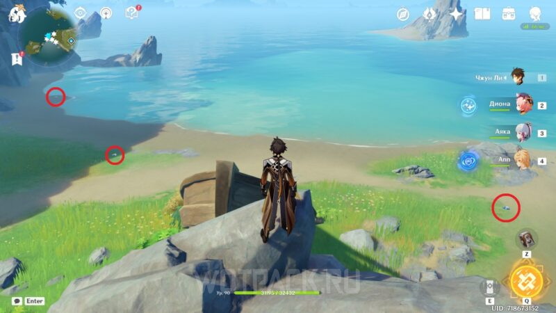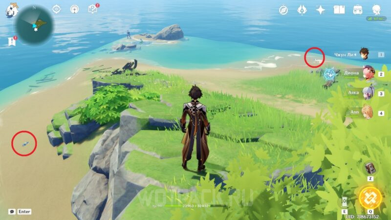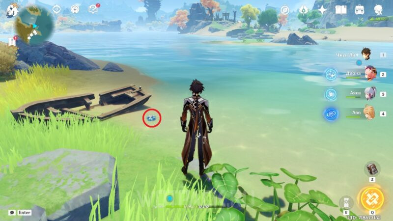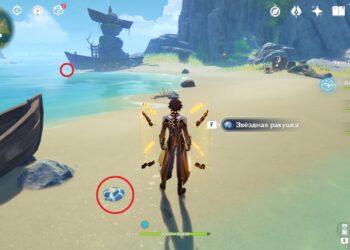 Дальше на западе соберите две диковинке в воде. Затем следуйте на берег, где копошатся в песке хиличурлы, и найдите еще две раковины.