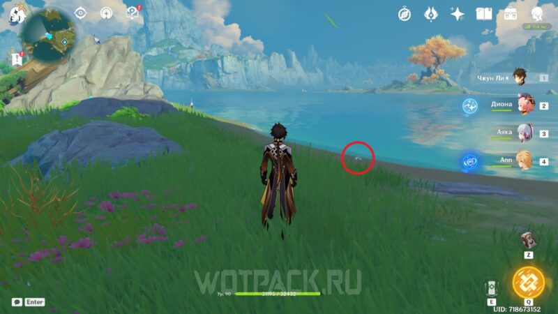 Затем идите четко на юг и вблизи веера, где можно использовать силу Анемо, заметите три раковины. Крайняя из них лежит за кустом.