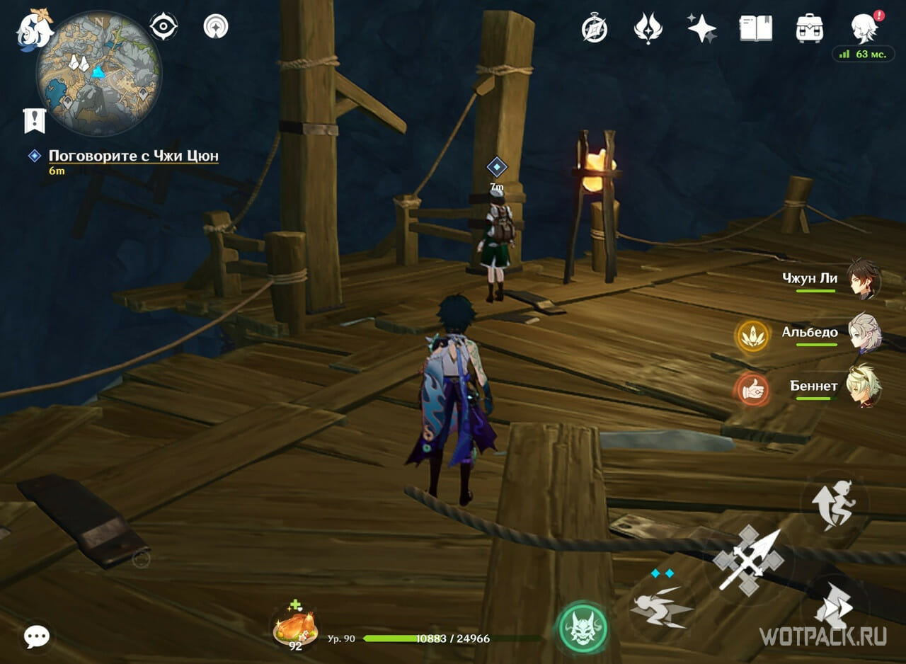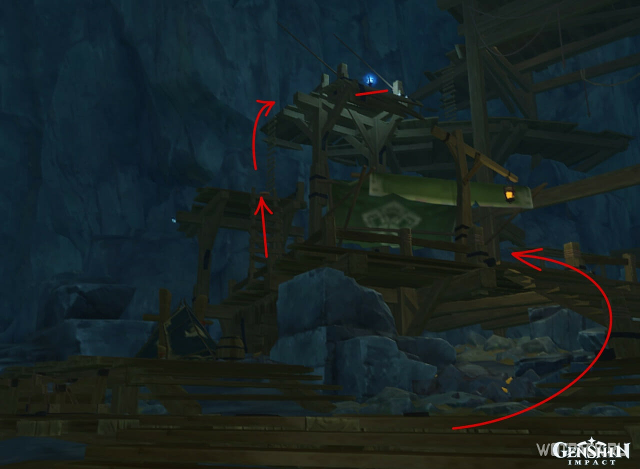 Далее идите прямо к мосту. На пути нападет Зеркальная дева Фатуи, можно просто пробежать мимо. У самого маркера разбит еще один лагерь похитителей сокровищ. Разберитесь с ними, чтобы не мешали прохождению.