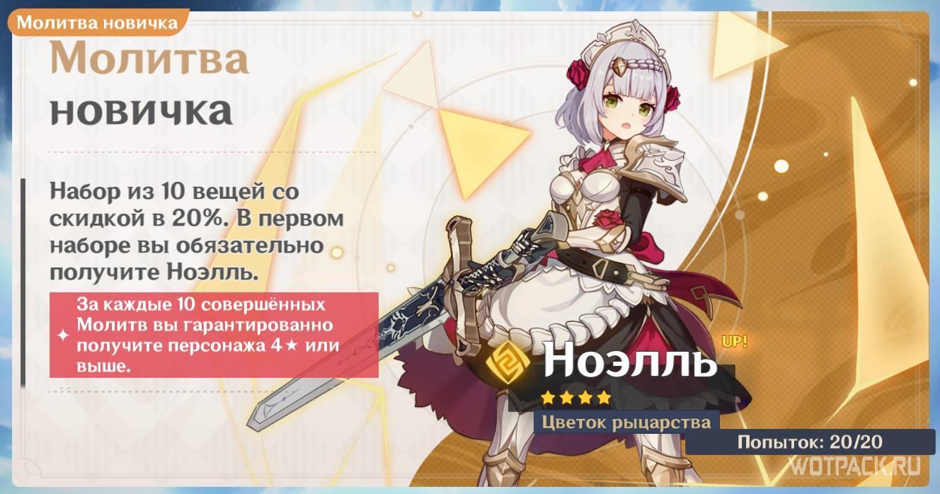 - Молитва новичка. Позволяет со скидкой (10 круток по цене 8) совершить 20 молитв, а также гарантированно получить 4⭐ Ноэлль в первом же наборе.