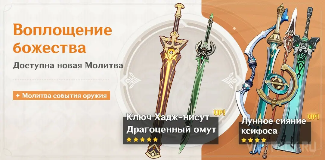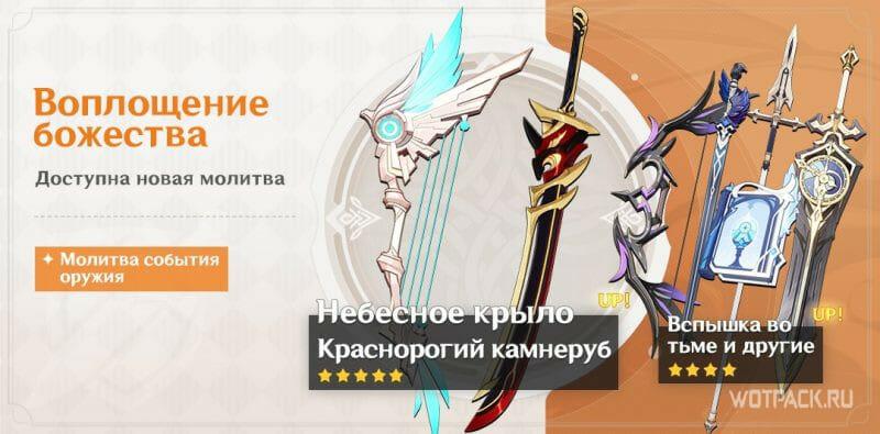 В оружейных баннерах временно появятся 5⭐ катализаторы Варесы«Переливающиеся чаяния» и Сянь Юнь «Звонкий клич журавля». Из 4⭐ снаряжения с ними будут одноручный меч Крепкая кость, копье Крепящий горы шип, двуручный меч Плодотворный крюк, катализатор Вихрь на волнах, лук Украшенные цветами перья.