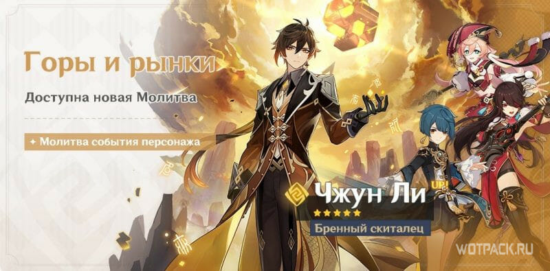 - Жажда странствий. Стандартная молитва, в которой могут выпасть 5⭐ персонажи Дилюк (Пиро, двуручное), Мона (Гидро, катализатор), Джинн (Анемо, одноручное), Кэ Цин (Электро, одноручное), Ци Ци (Крио, одноручное), Тигнари (Дендро, стрелковое), Дэхья (Пиро, двуручное) или оружие из Небесной серии, Лук Амоса, Молитва святым ветрам, Нефритовый коршун, Волчья погибель, Меч сокола. В ней также представлены все эпические герои, кроме тех, что находятся во временном баннере в соответствующий период. Однако из молитвы можно выбить только определенное 4⭐ оружие: Ржавый лук, Бесструнный, Церемониальный лук, Боевой лук Фавония, Око сознания, Церемониальные мемуары, Песнь странника, Кодекс Фавония, копье Фавония, Гроза драконов, Церемониальный двуручный меч, Дождерез, Меч-колокол, Двуручный меч Фавония, Церемониальный меч, Драконий рык, Меч-флейта, Меч Фавония.