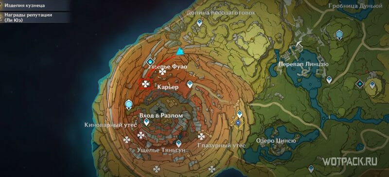 Продолжайте идти по правой стороне, чуть ниже заметите хилличурлов копающих руду. Средни нее будет и искомый предмет.