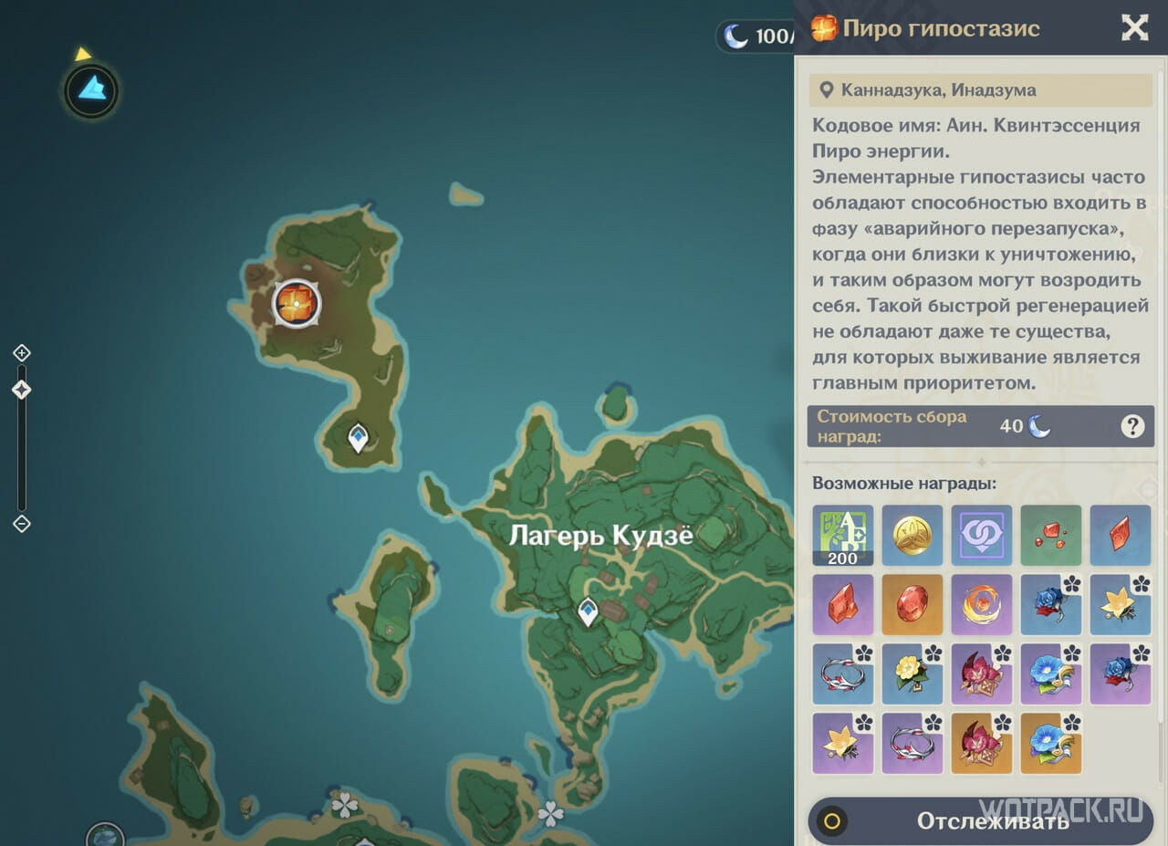 Пиро гипостазис – квинтэссенция Пиро энергии. Находится на севере острова Каннадзука в Инадзуме. Потушите его пламя, чтобы получить ресурсы.