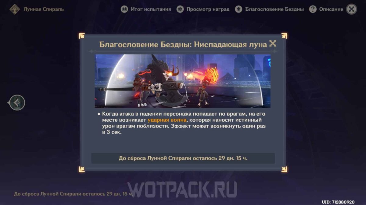 Текущее Благословение Бездны — Ниспадающая луна. Если герой попадает по врагам атакой в падении, то под ним возникает ударная волна с истинным уроном. Эффект может сработать раз в 3 секунды.
