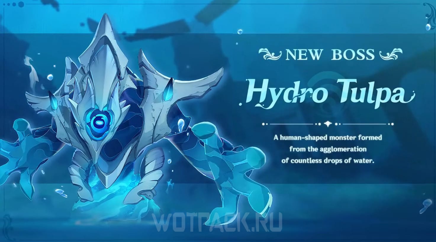Гидротульпа в Genshin Impact — мировой босс региона Фонтейн. Пробужденная жизнь огромного скопления капель воды, принявшая человекоподобную форму. Постоянно порождает новых антропоморфных монстров, чтобы затем поглотить их. Босс имеет иммунитет к Гидро и способен атаковать различным оружием, в том числе и дальним. Это может затруднить сражение, так как снижает эффективность некоторых героев и требует особой стратегии поведения, отличающейся от обычного боя с боссами.