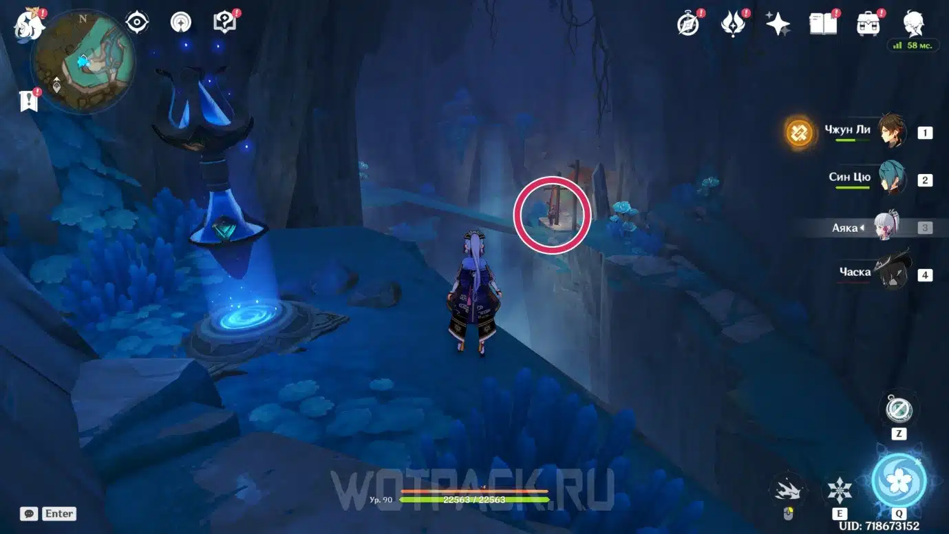 Телепортируйтесь к северо-западной точке Колыбели мимолетных грез и спланируйте вниз, к площадке с мертвыми хиличурлами. Среди павших монстров найдете фиолетовый богатый сундук — откройте его и сразитесь с первой мимифлорой.