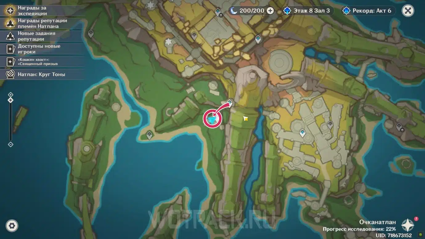 Доберитесь до восточной части Очканатлана и спланируйте к воде — между двумя скалами обнаружите руинные механизмы. Победите фиолетового стража руин, поговорите с Кенином и откройте богатую сокровищницу.
