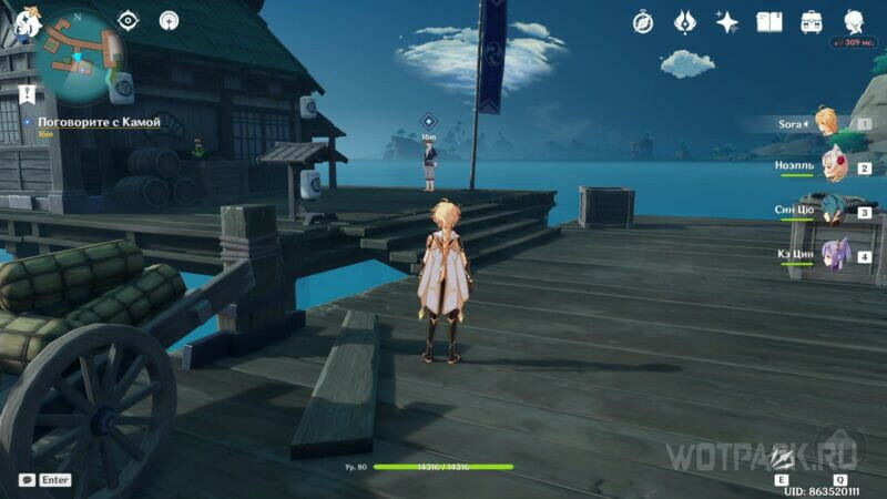 Найдите Каму у входа на Цуруми. Поговорите с ним у якорной стоянки, чтобы вернуться на остров Рито. Добравшись обратно, направляйтесь к госпоже Сумиде в Инадзуму и поговорите с ней.
