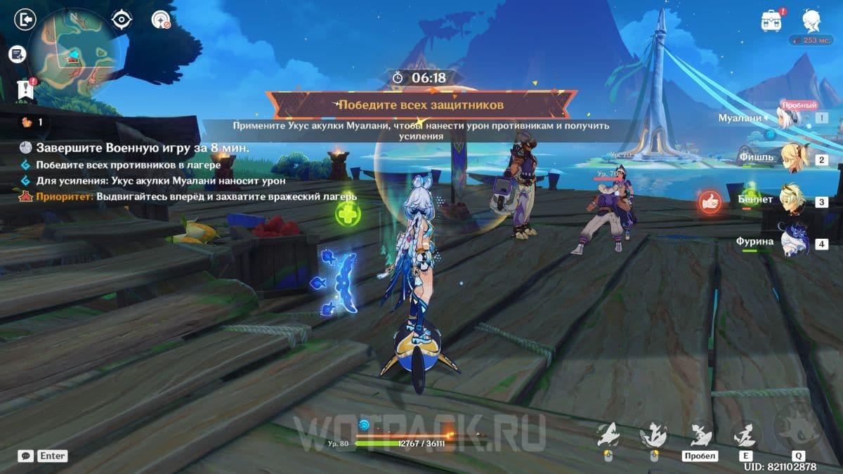 Как только все опорные пункты и ритуальные предметы активированы, выдвигайтесь вперед и захватите вражеский лагерь. Для этого нужно одолеть две волны врагов. Не забывайте использовать Укус акулки Мулани для получения баффов, задействуя удары обычной атакой.