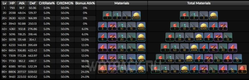 Основная характеристика Эмбер, которая повышается при возвышении, – бонус атаки %. Кроме нее, растут показатели HP, силы атаки и защиты. Более точные значения можно узнать из таблицы ниже.