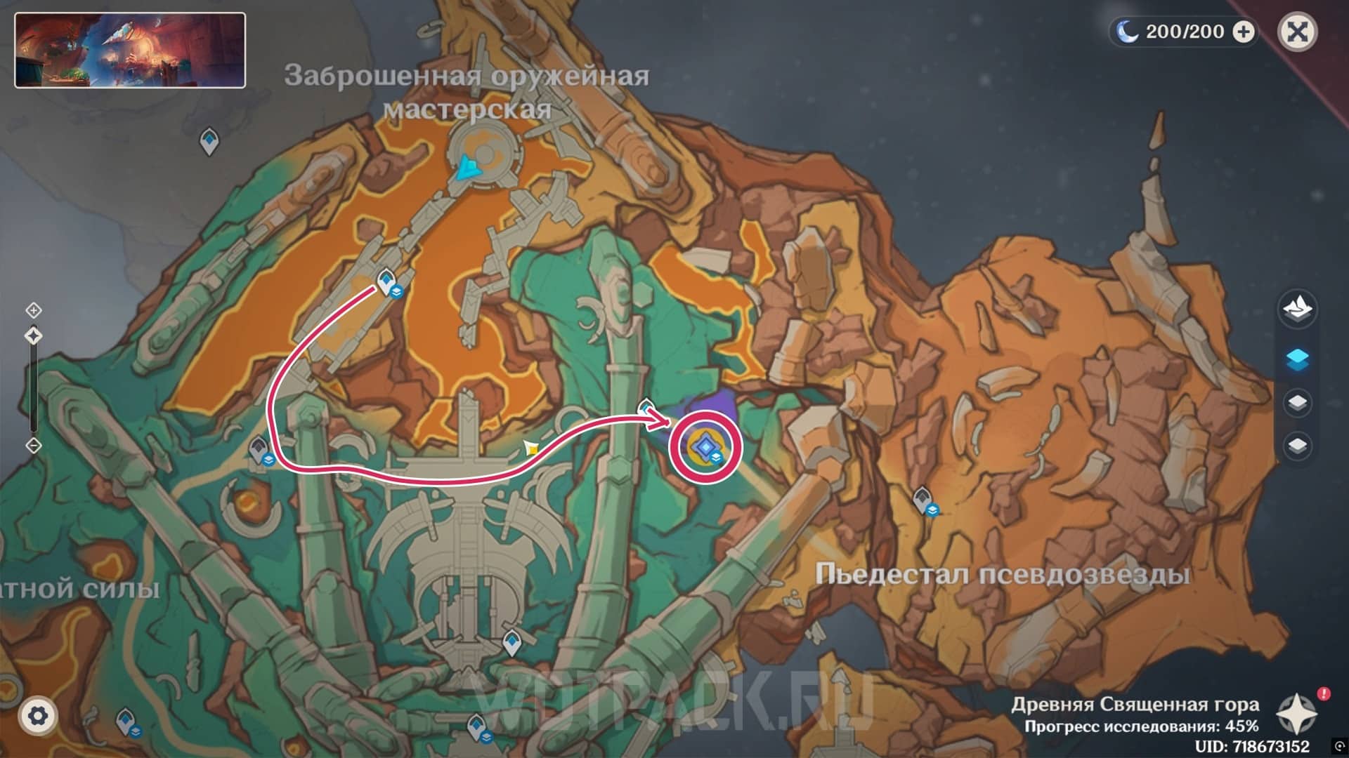 Вернитесь в локацию Древняя Священная гора, если отвлекались от прохождения цепочки, и отправляйтесь по дороге к Пьедесталу псевдозвезды. У телепорта в заброшенной мастерской вселитесь в татанказавра, чтобы быстрее преодолеть маршрут. Спуститесь на юг — следуйте прямо до развилки и нового портала.