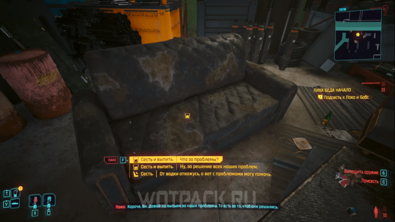 Садитесь на диван рядом с солдатами, чтобы послушать об их проблемах и приступить к выполнению квеста. Пако расскажет, что его обещают убить. Если согласитесь выслушать юношу, он поведает свою историю, в которую Ви и перенесется.