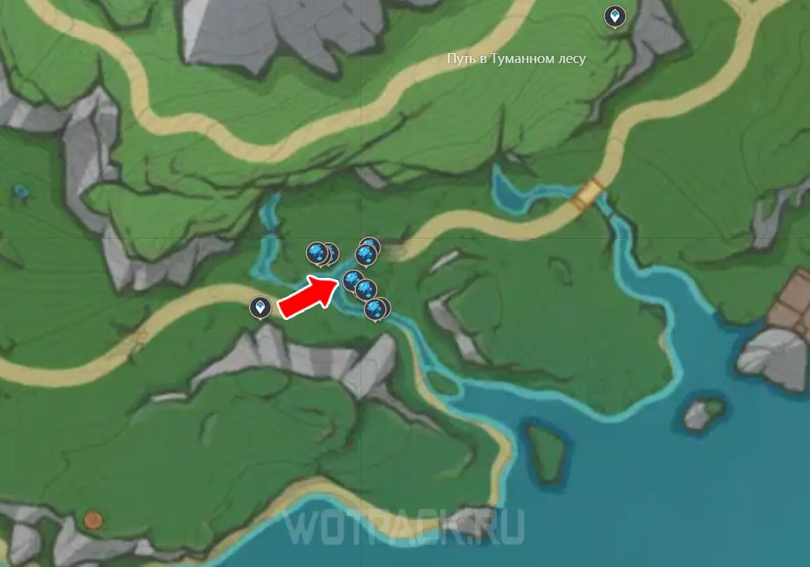 От ближайшей точки телепортации на Пути пройдите в сторону водоема, чтобы собрать три растения слева у берега.