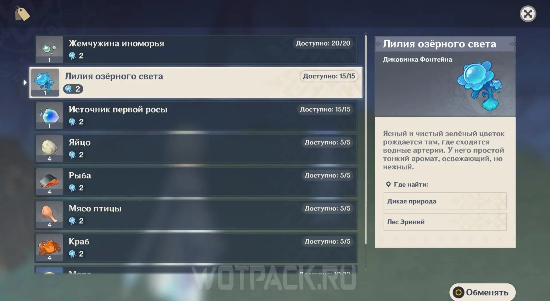 15 лилий озерного света можно обменять у мелюзины Пашив, в пещере за Озером Урании после завершения цепочки квестов «Дикая фея Эриний». Для покупки потребуется 30 тидалий, а совершить обмен получится лишь один раз.