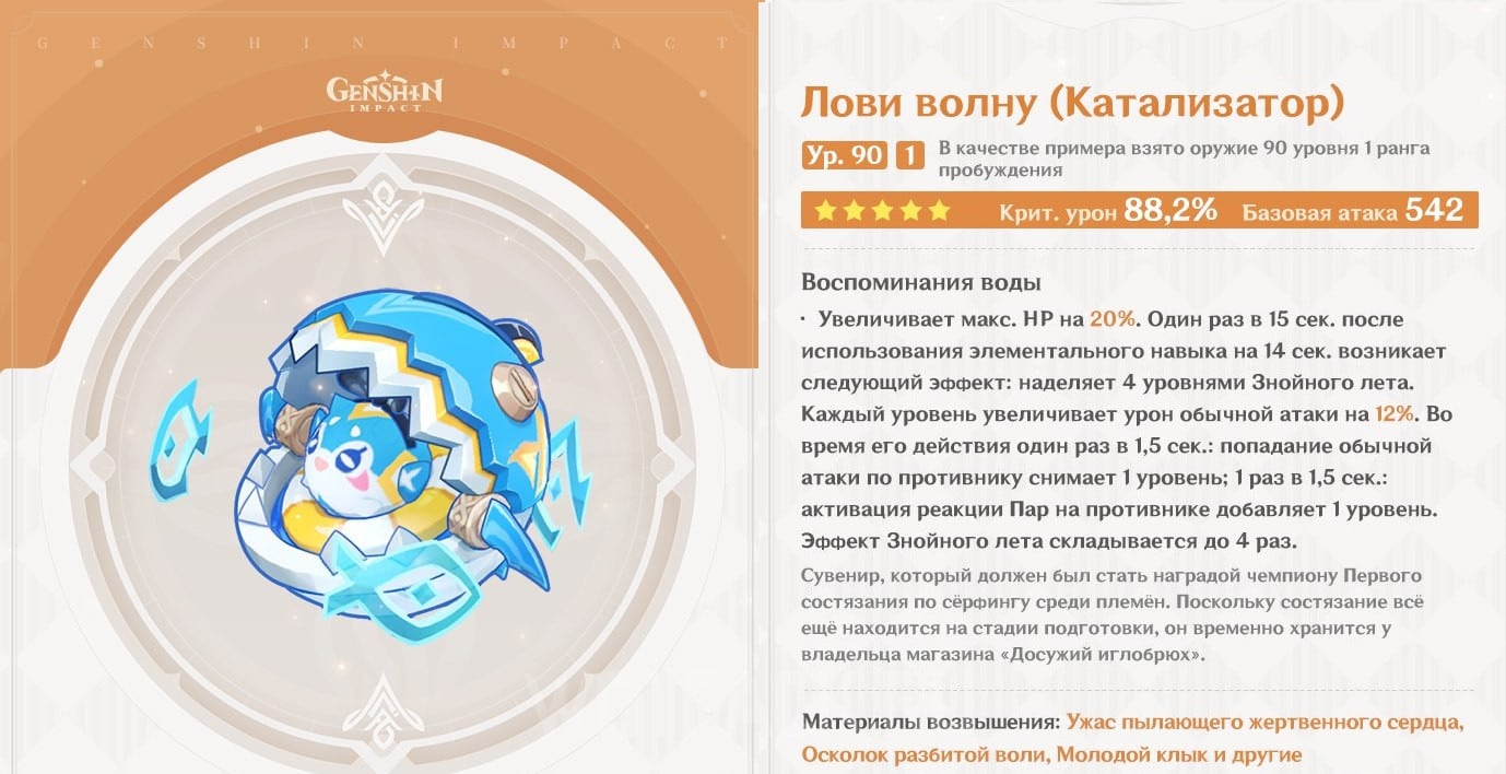 Лови волну в Genshin Impact — катализатор легендарной редкости, являющийся сигнатуркой Муалани. Первой частью пассивной способности он повышает показатель здоровья своего владельца, и, в отличие от большинства оружия такой направленности, ориентирован не на саппортов, а на основного дамагера, использующего обычные атаки и играющего в определенных командах.