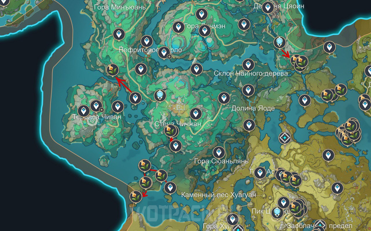 В долине Чэньюй получится собрать 12 львиных зевов. Три цветка растут у северной Статуи Архонта в области, еще два у телепорта рядом с боссом Суаньни-отшельник. Четыре растения заберете на юге области, и последний к северу от Горы Лайсинь.