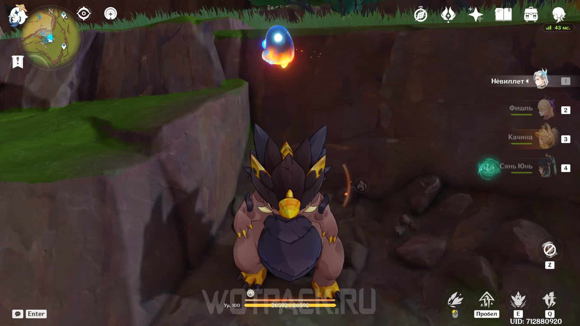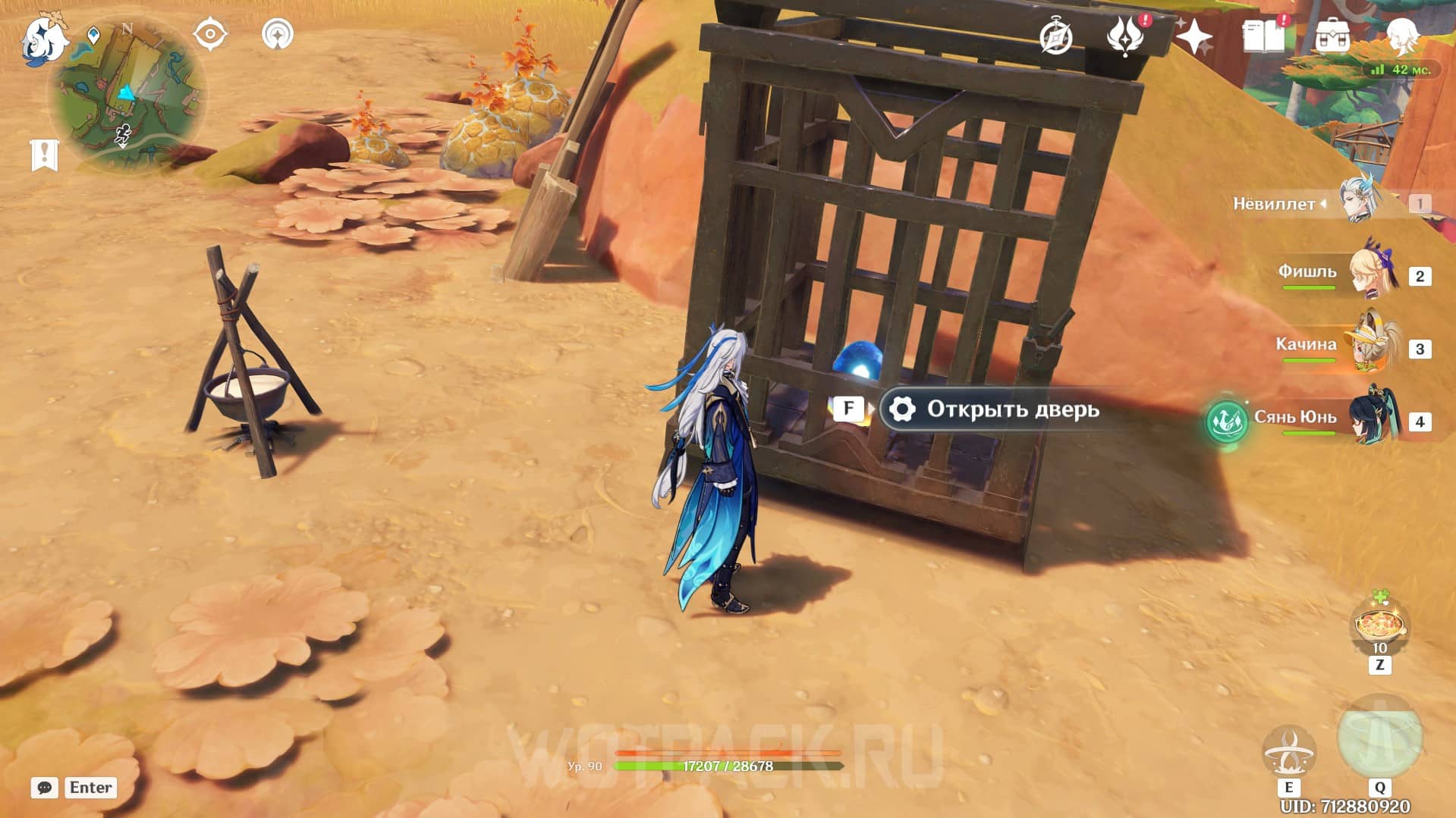 У восточного горного образования хиличурл смотрит на клетку с Маниту 43. Обойдите ее и дерните за крючок сзади колонны, чтобы отодвинуть ее и после открыть решетку.