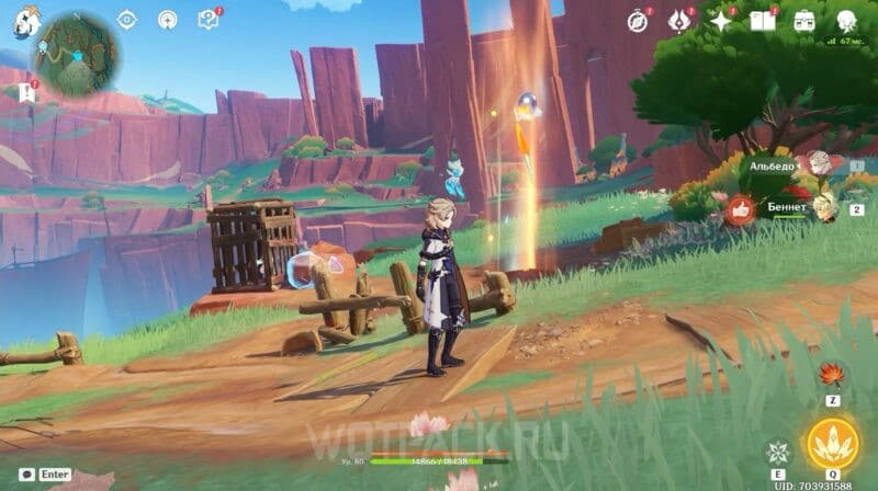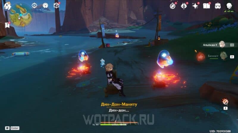 К северу среди гор заполните ресурсом флогистона Маниту 39. Далее взаимодействуйте с точкой у камня и победите двух крупных Гео слаймов для создания безопасного пути.