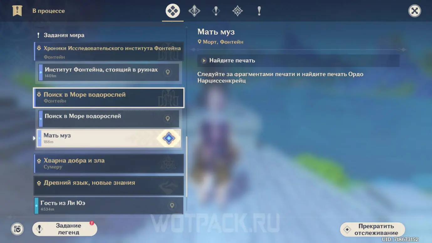 Необходимо приступить к заданию «Поиск в Море водорослей» и дойти до этапа «Найдите и снимите 4 печати», чтобы открыть квест «Мать муз».