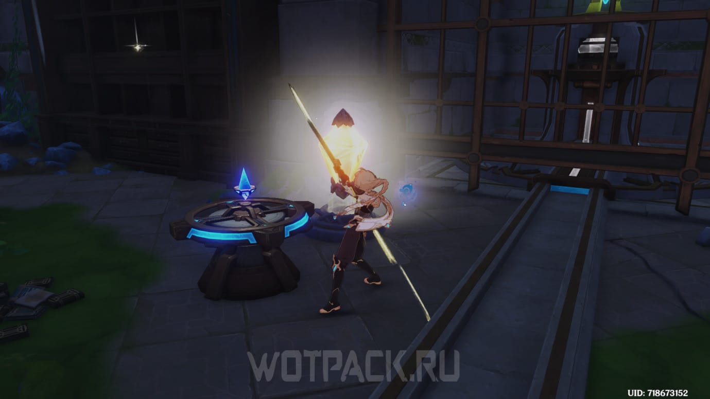 Ударьте по кристаллу, чтобы он стал желтым и убрал преграду на стене. После чего встаньте у створчатого клапана так, чтобы смотреть прямо на луч Элифаса, закрепленный на подъемной колонне.