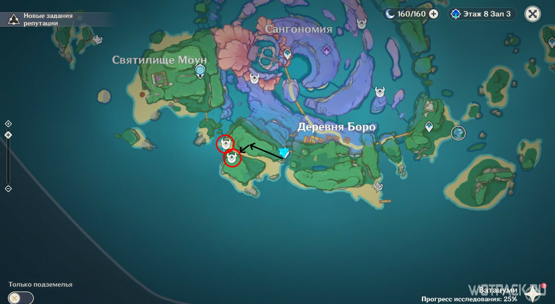 Телепортируйтесь на восток Ватацуми, справа пара Нобуси. Одолейте их и пройдите к небольшим островкам на юго-запад, там еще одна группа.
